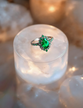 Насыщенность, пожалуй, — самый драматичный фактор ценообразования. Она описывает яркость, чистоту и интенсивность цвета. Камень может иметь правильный оттенок и тон, но если его цвет тусклый, сероватый или «пыльный», его цена будет невысокой. Изумруды с высокой степенью насыщенности (vivid или deep) кажутся светящимися изнутри. Создается ощущение, что в камне горит зеленый огонь. Кольцо с изумрудом высокой насыщенности всегда будет стоить дороже, даже если сам камень меньше по весу или имеет видимые включения, чем крупный, но тусклый экземпляр.
